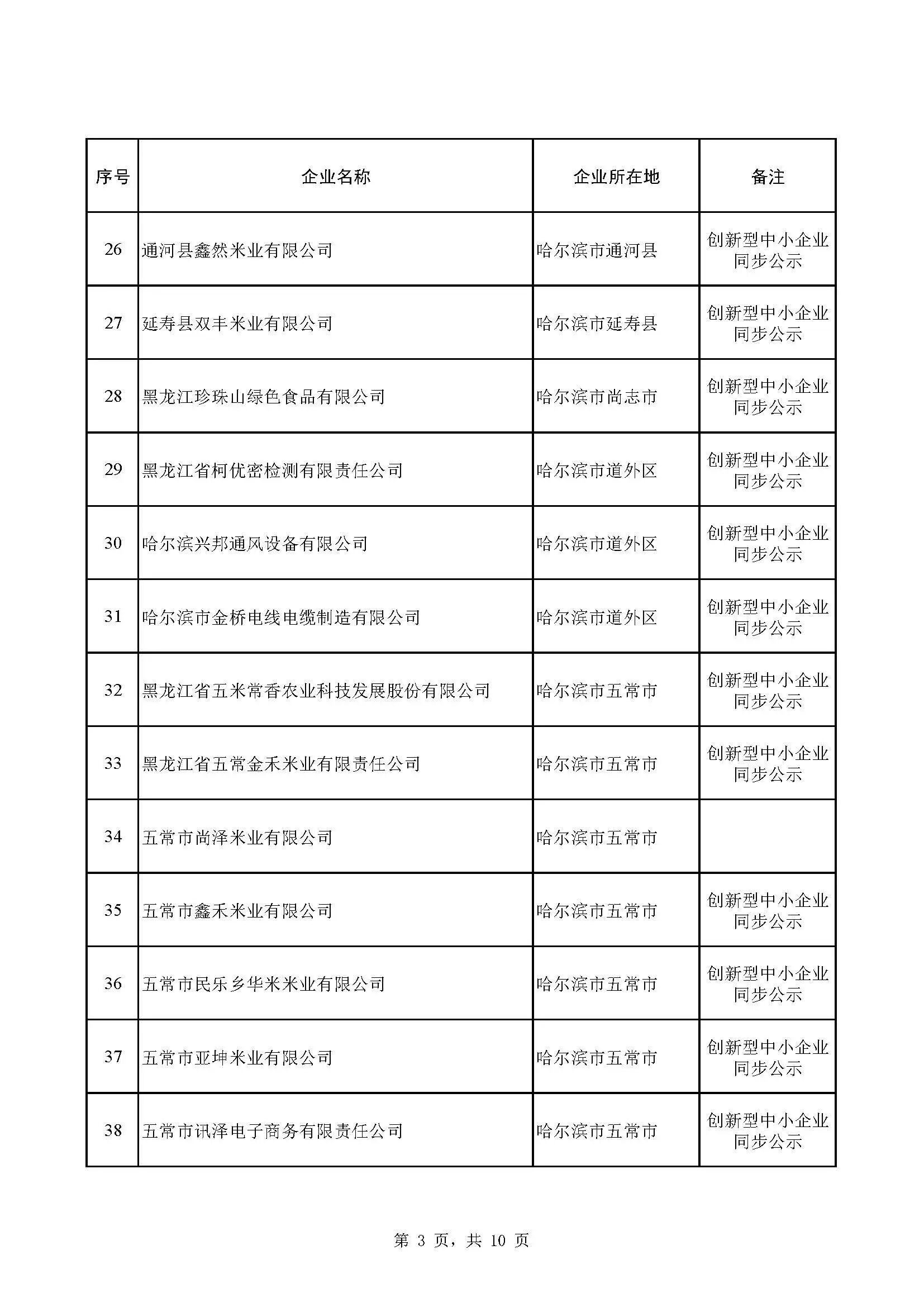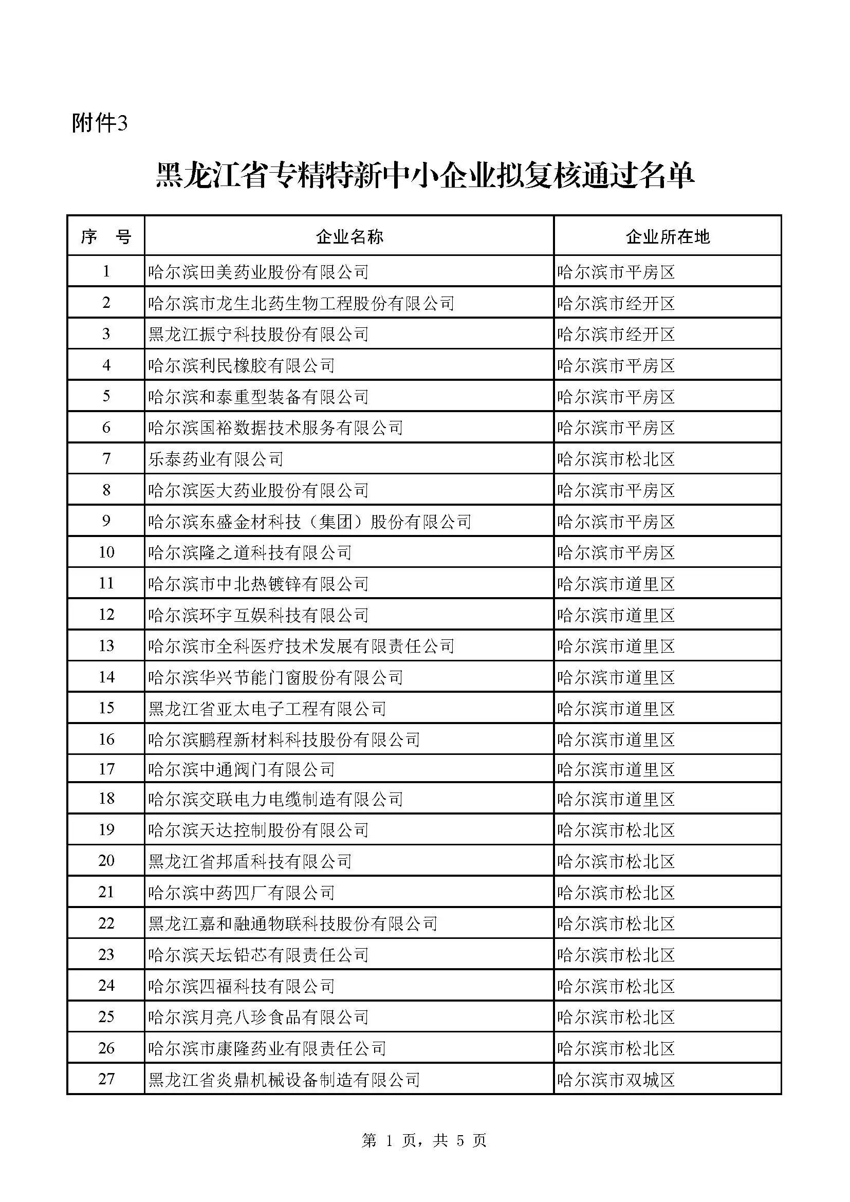 依据《优质中小企业梯度培育管理暂行办法》(工信部企业〔2022〕63号)和《黑龙江省专精特新中小企业认定实施细则》(黑工信企业规〔2024〕10号)有关规定,按照《关于组织开展2026年黑龙江省第一批创新型中小企业评价和专精特新中小企业认定(复核)工作的通知》(黑工信企业函〔2026〕80号)要求,省工信厅组织开展了2026年第一批创新型中小企业评价、专精特新中小企业认定(复核)及优质中小企业简单更名工作。经企业自愿申报、市(地)推荐、专家评审、信用信息核查等程序,拟评价哈尔滨市跃程机械制造有限公司等119户企业为2026年第一批创新型中小企业,拟认定哈尔滨滨大科技有限公司等127户企业为2026年第一批专精特新中小企业,哈尔滨田美药业股份有限公司等138户企业拟通过复核,拟通过黑龙江科朗制药有限公司等2户企业优质中小企业简单更名,现予以公示。公示期为2026年3月23日—3月27日(5个工作日)。如有质疑或意见,请在公示期内据实反映。