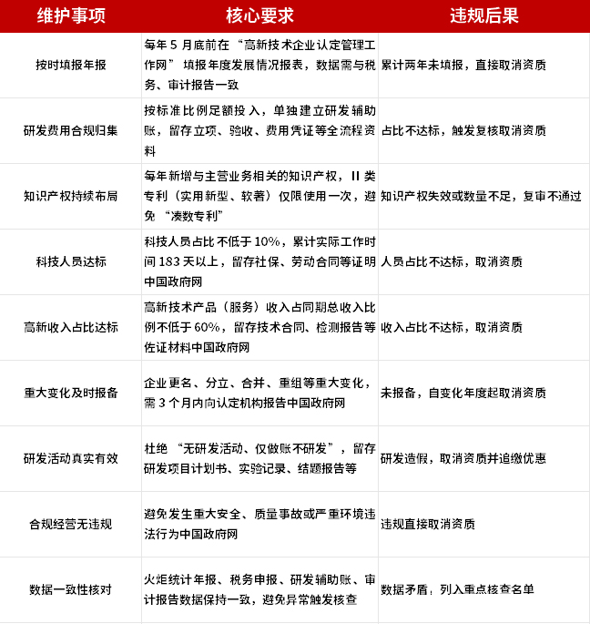 高企资质并非 “终身制”,资格有效期 3 年,期间需接受科技、财政、税务部门动态监管,做好以下 9 项维护工作,才能持续保住资质: